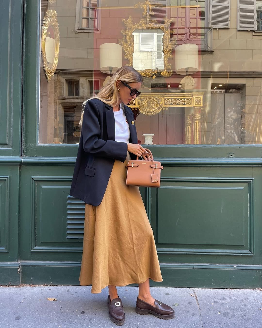 This one leans into that timeless, slightly academic feel. A sharp navy blazer over a simple white tee meets a warm camel skirt, and suddenly you’ve got a look that feels both heritage-inspired and city-ready.