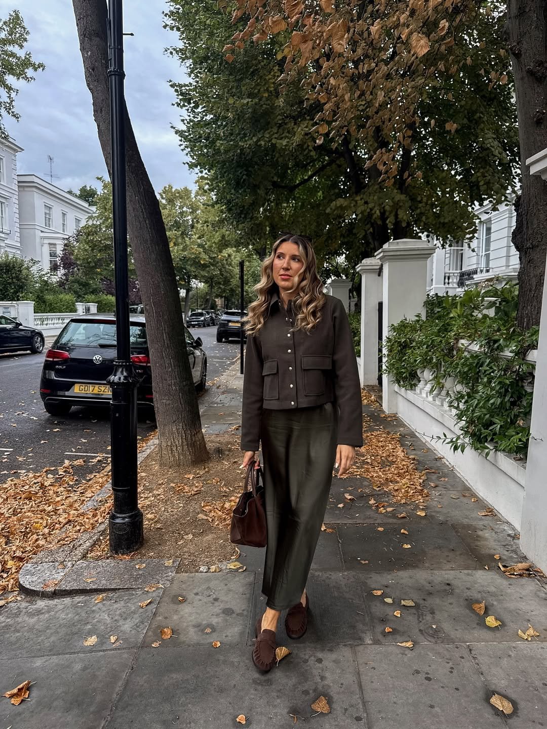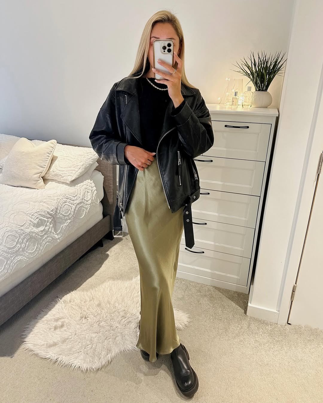Here’s where the satin skirt gets a little attitude. The silky olive skirt paired with a black knit and oversized leather jacket creates a strong contrast that instantly elevates the look.