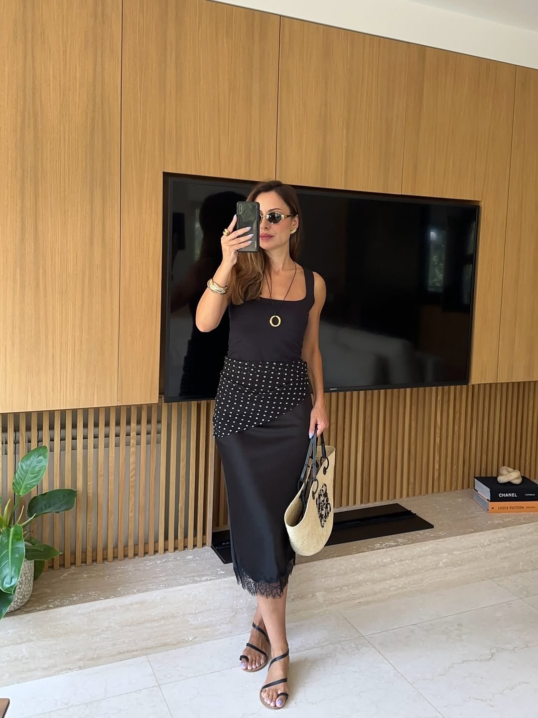 This look feels powerful in the most understated way. The satin black skirt paired with a tailored vest creates a silhouette that’s clean, structured, and undeniably chic.