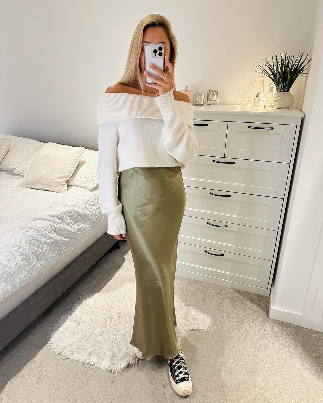 This outfit leans beautifully into quiet elegance. The off-shoulder knit brings a soft, romantic touch, while the olive satin skirt adds a sleek silhouette that feels effortlessly refined.