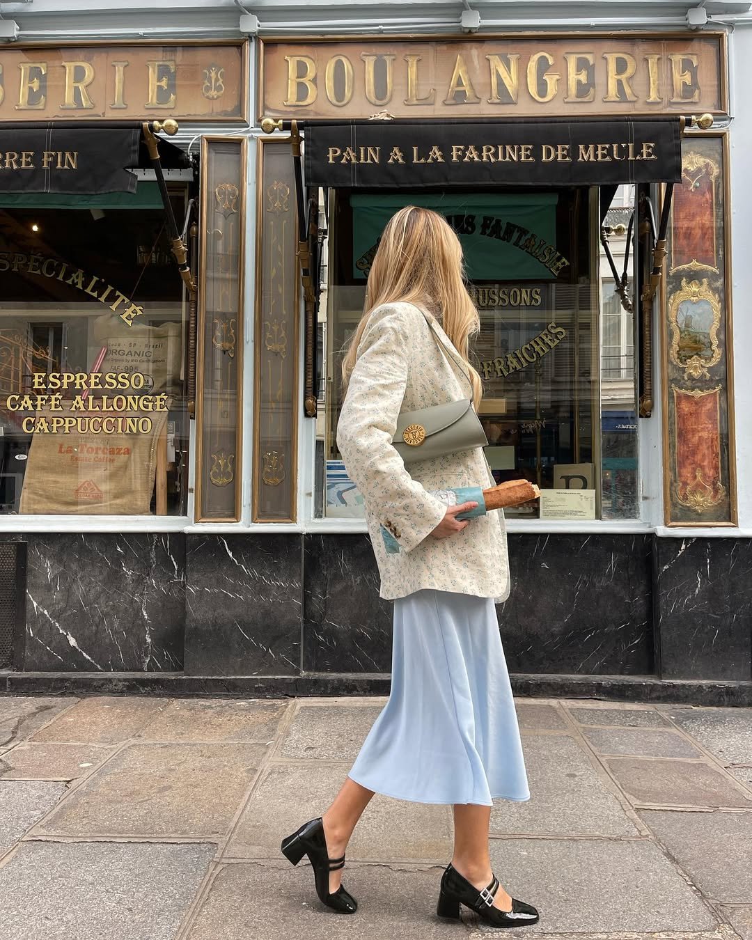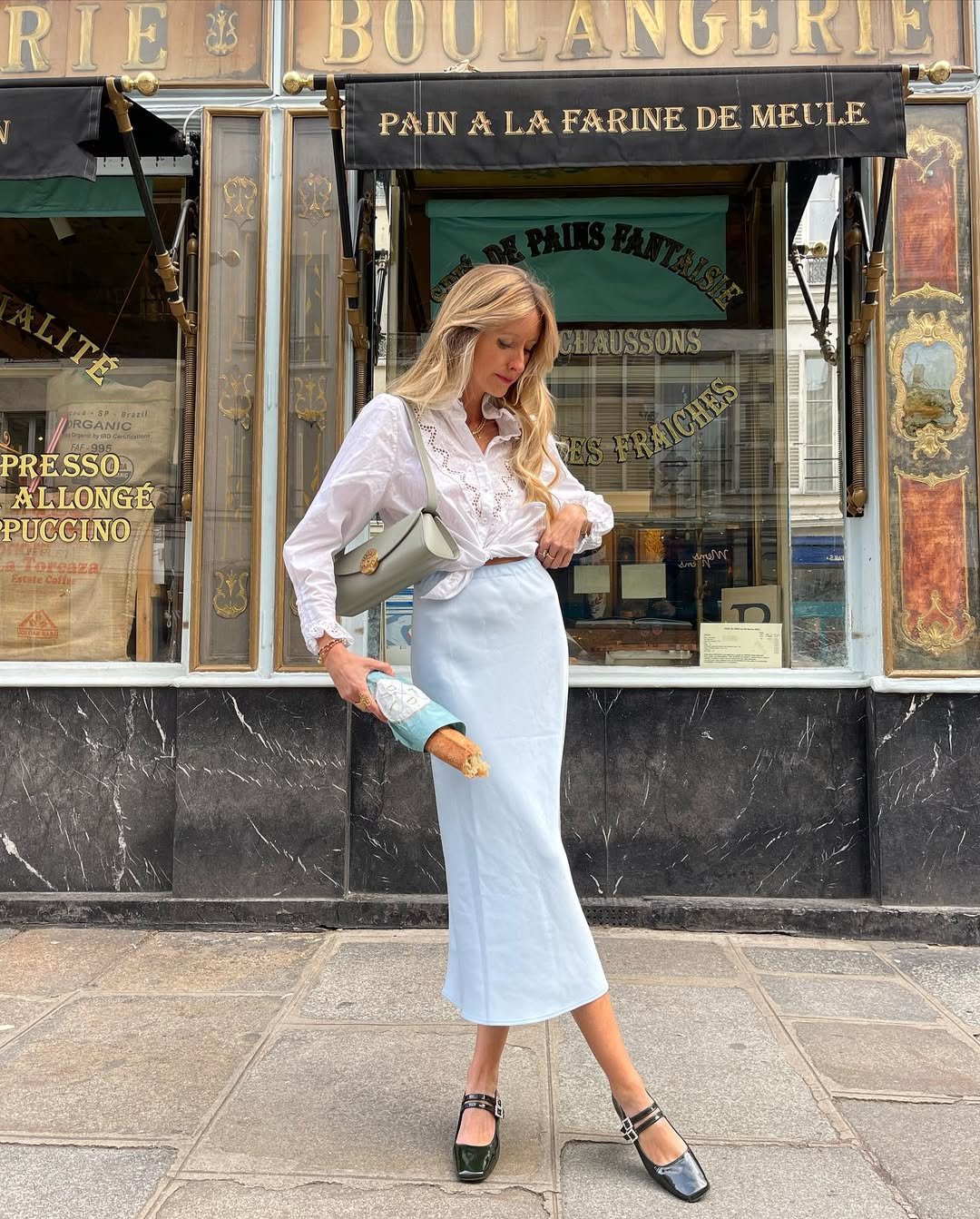You can almost hear the café chatter in this one. A crisp white blouse tucked into a powder blue slip skirt feels fresh and romantic, especially with that baguette casually in hand.