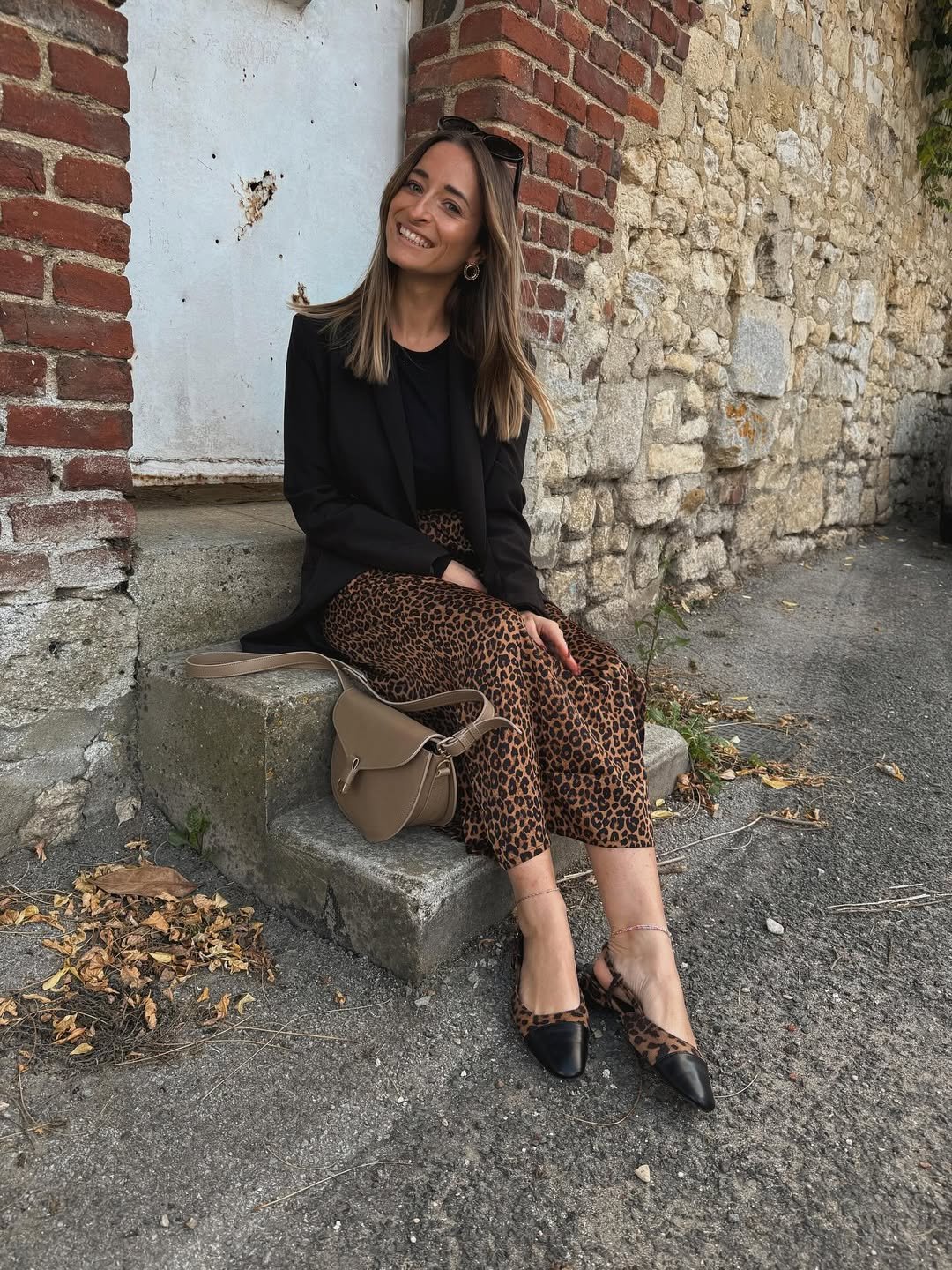 There’s a fun contrast happening here that keeps things interesting. A classic black blazer meets a bold leopard skirt, creating a mix that feels both polished and expressive.
