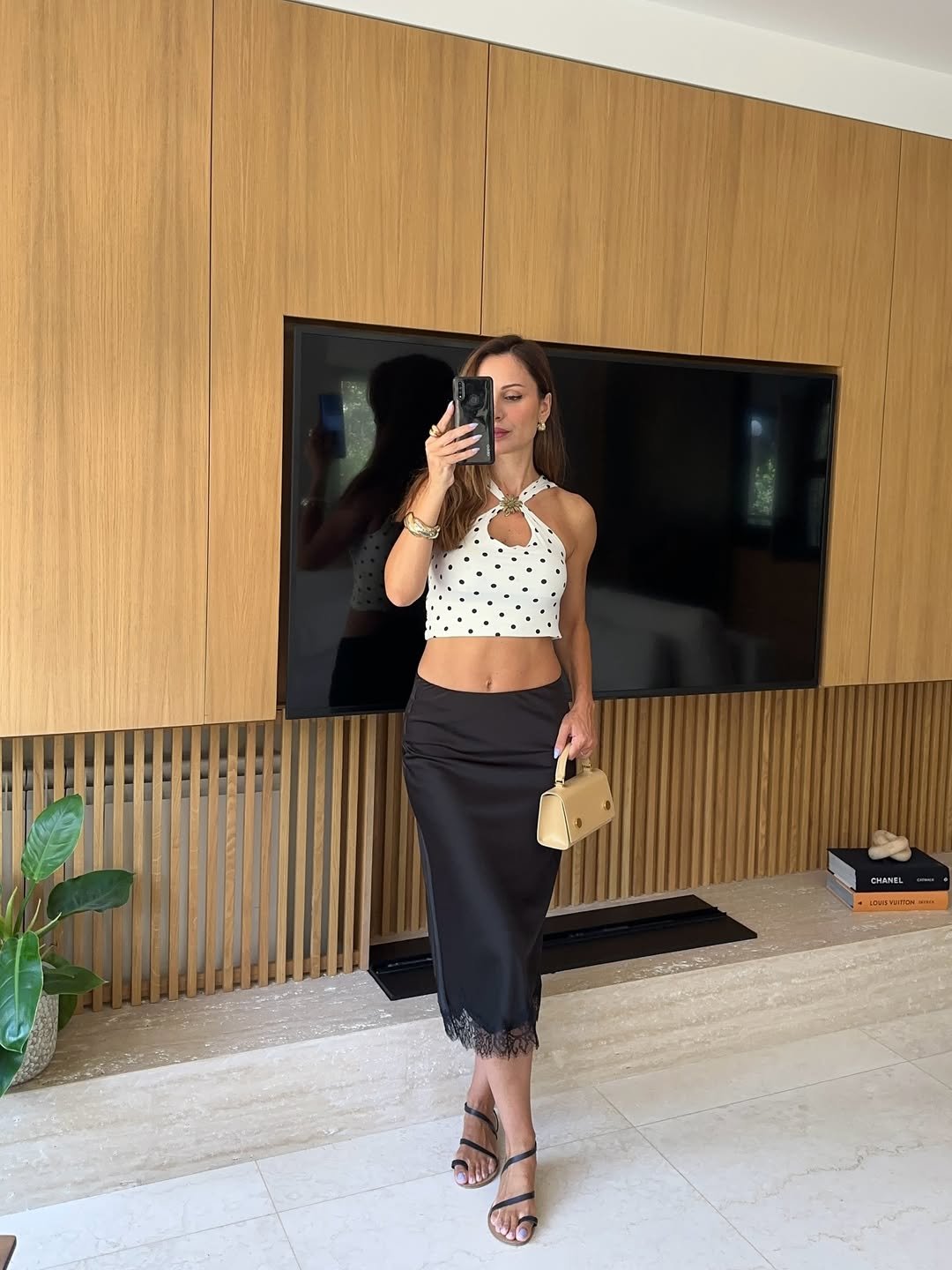 There’s a subtle charm in this combination that feels fresh and modern. The polka dot top adds personality, while the satin skirt keeps everything grounded and refined.