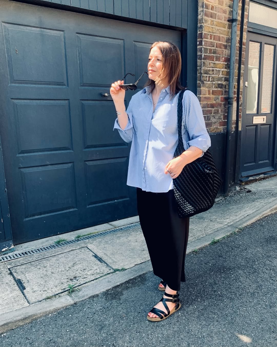 Flat sandals and a woven tote keep things grounded and practical. It’s ideal for warm afternoons when you want to feel put together but still completely comfortable.