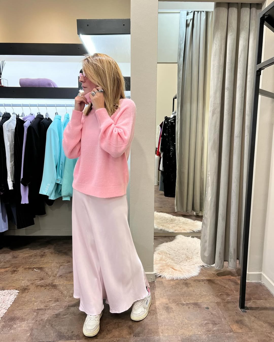 There’s something about this look that feels instantly cheerful. The fluffy pink sweater paired with a pale satin skirt creates that dreamy contrast between cozy knit texture and soft flowing fabric.
