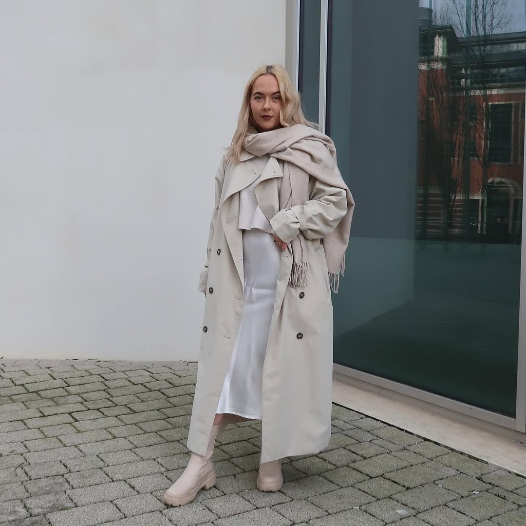 There’s a quiet confidence in this look that feels instantly elevated. The layered cream tones, from the fluid satin skirt to the structured trench and oversized scarf, create a soft monochrome moment that reads polished without trying too hard.