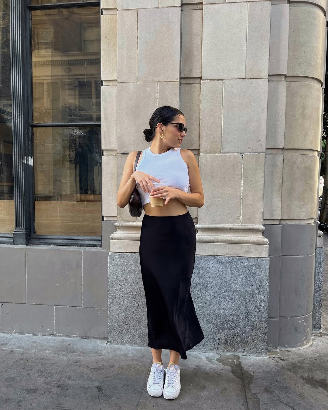 This look strips everything back in the best way. A clean white cropped tank paired with a black slip skirt feels sharp, simple, and just a little bit sporty.