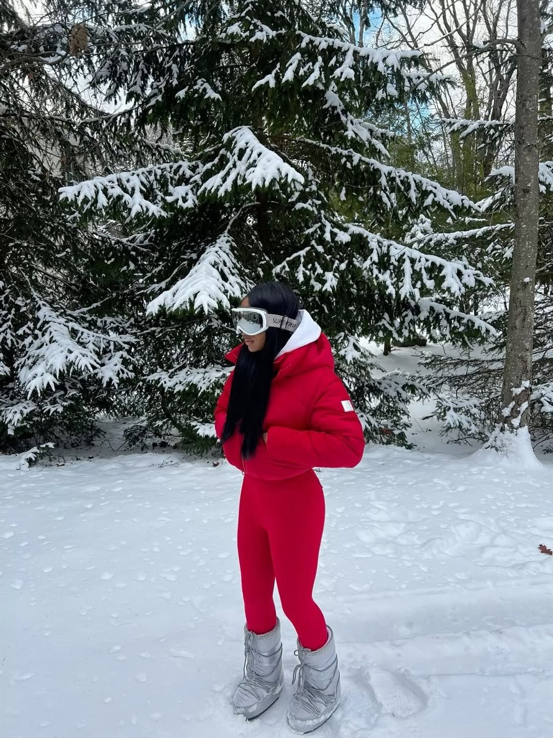 Nothing cuts through a snowy forest like a bright red outfit. The fitted red base paired with a puffer jacket gives this look that striking contrast that instantly catches the eye.