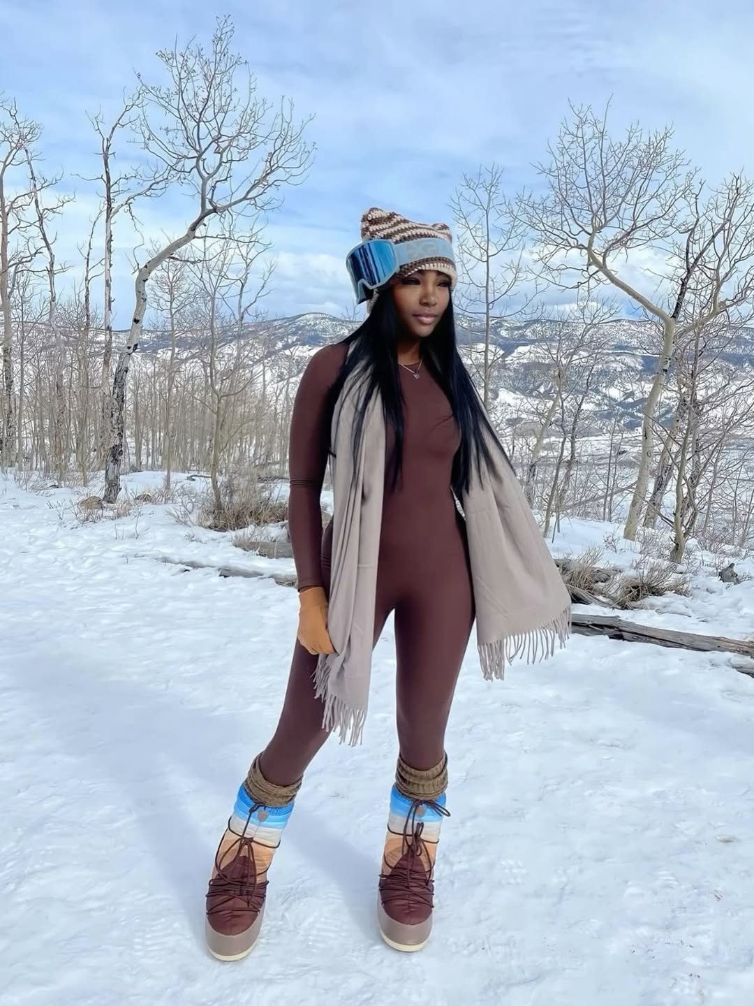 This look feels like the calm moment before heading out onto the slopes. The earthy brown base layer paired with a soft scarf and cozy beanie brings a relaxed, almost cabin-weekend vibe.