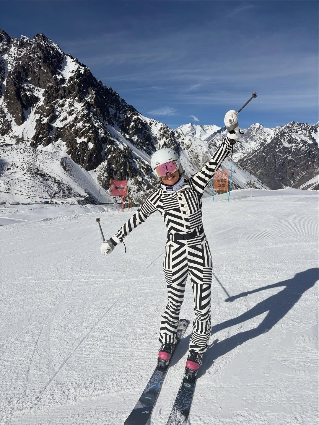 This bold black-and-white ski suit makes a serious statement on the slopes. The geometric pattern feels graphic and modern, almost like wearable art against the crisp white snow.