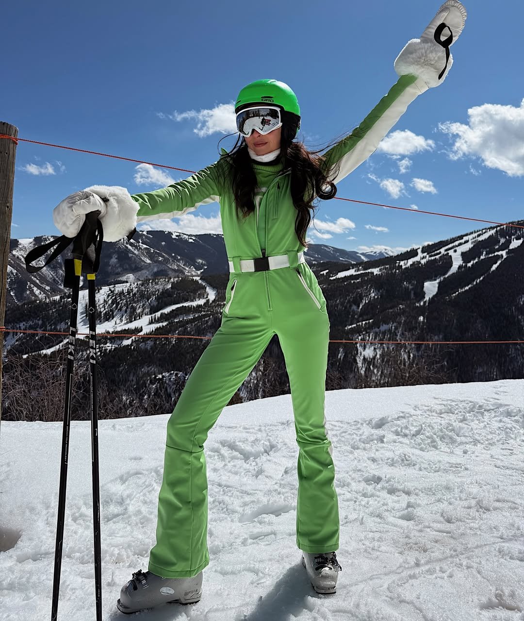 This look brings serious energy to the mountains. The bright lime green ski suit instantly pops against the snowy peaks, and the matching helmet ties everything together in that bold, confident way that’s impossible to ignore.