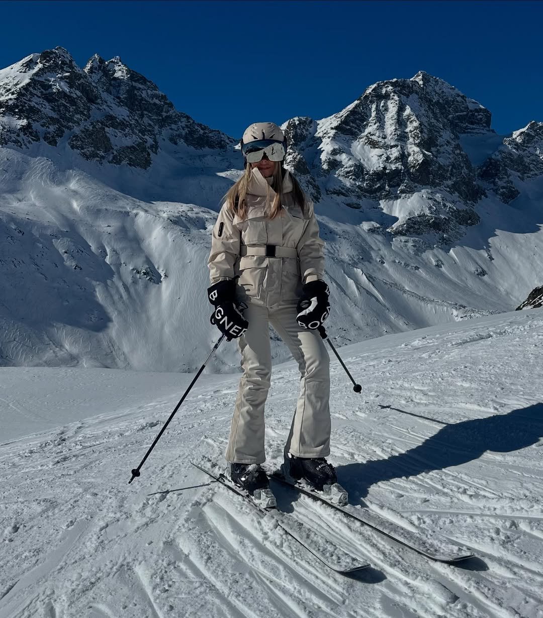 There’s something about a clean white ski outfit that just feels iconic. Against the sharp mountain backdrop, this look pops in the best way—like a winter version of a classic power suit.