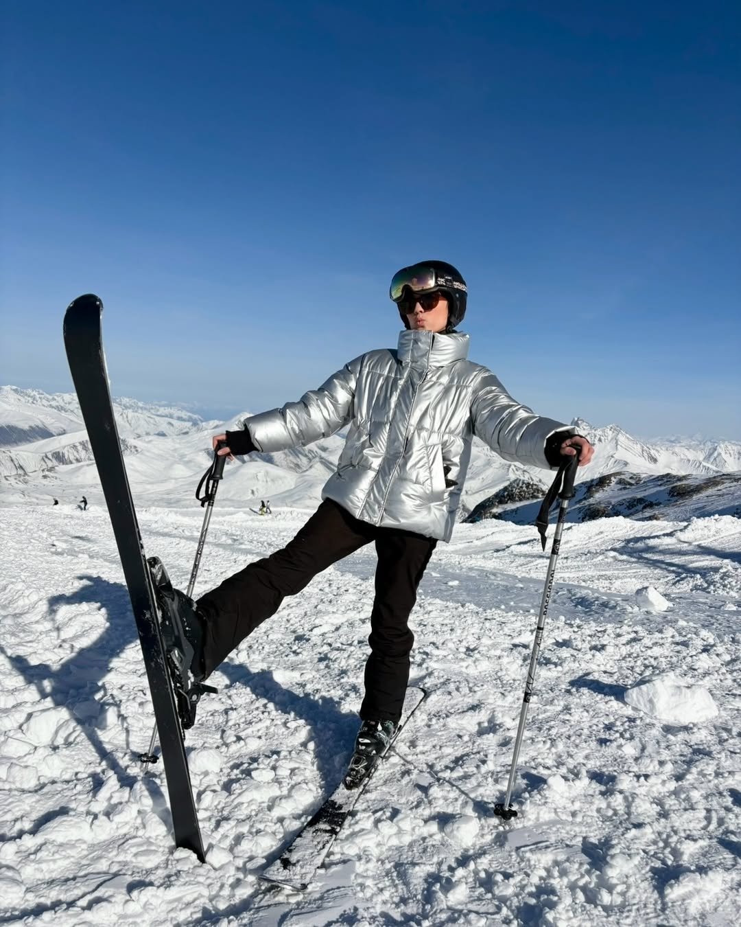 That silver puffer jacket instantly steals the show. Against the bright mountain backdrop, it adds a futuristic edge that makes the whole outfit feel bold and fashion-forward.
