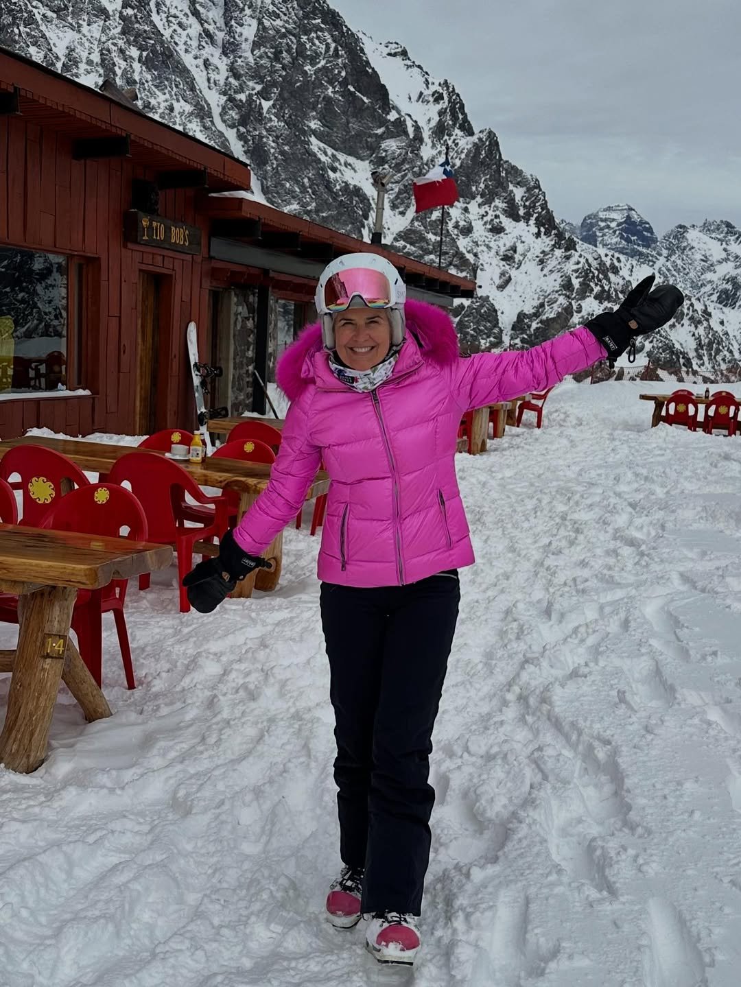 This look is pure winter joy. The bright pink puffer jacket instantly lifts the whole scene, especially against the snowy lodge setting and rugged mountain backdrop.