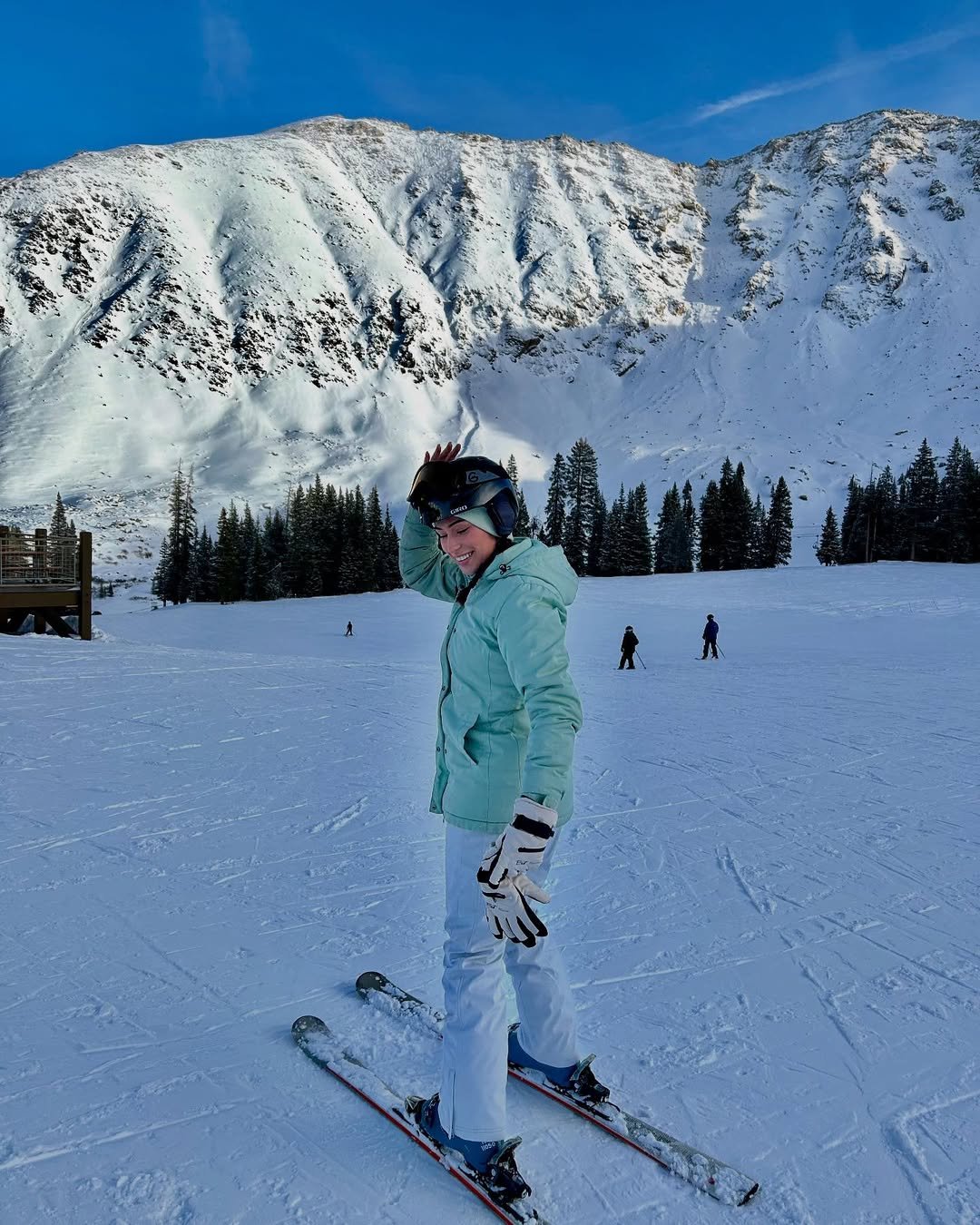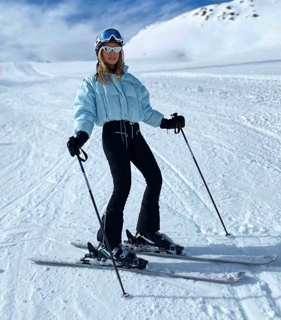 Soft blue outerwear against bright white snow? Always a win. This look feels light, fresh, and perfectly suited for those sunny mountain days when everything looks like a winter postcard.