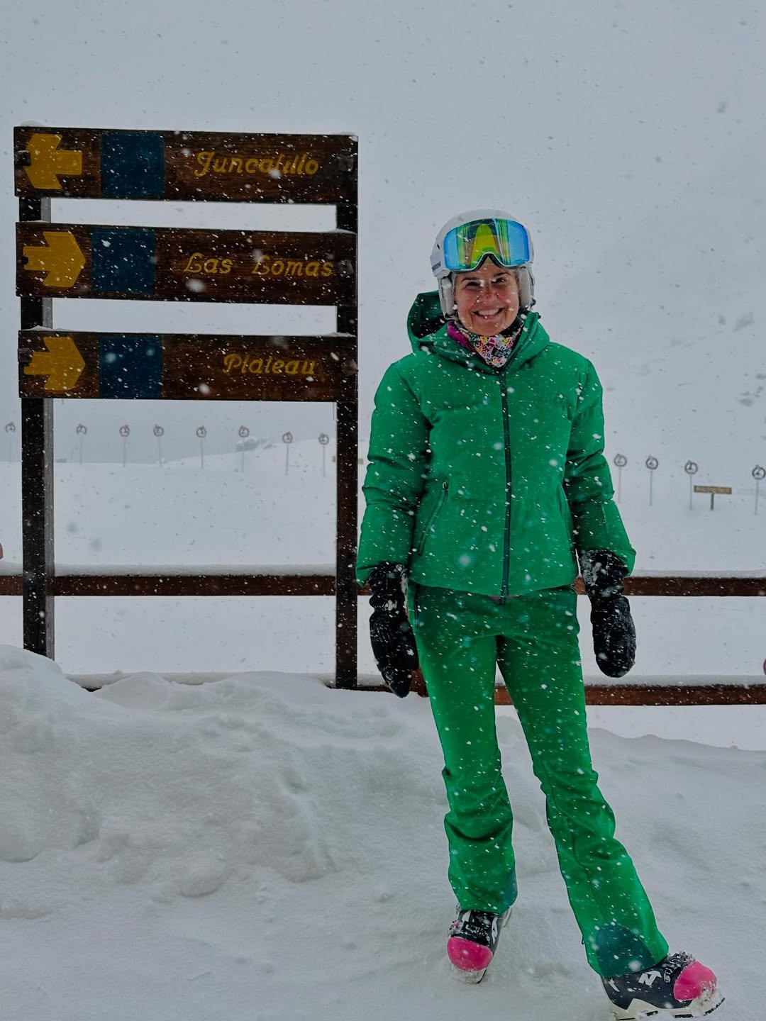 Snow falling, visibility low, and the outfit still manages to shine. The vibrant green ski set keeps things bright and cheerful even in the middle of a snowy storm.
