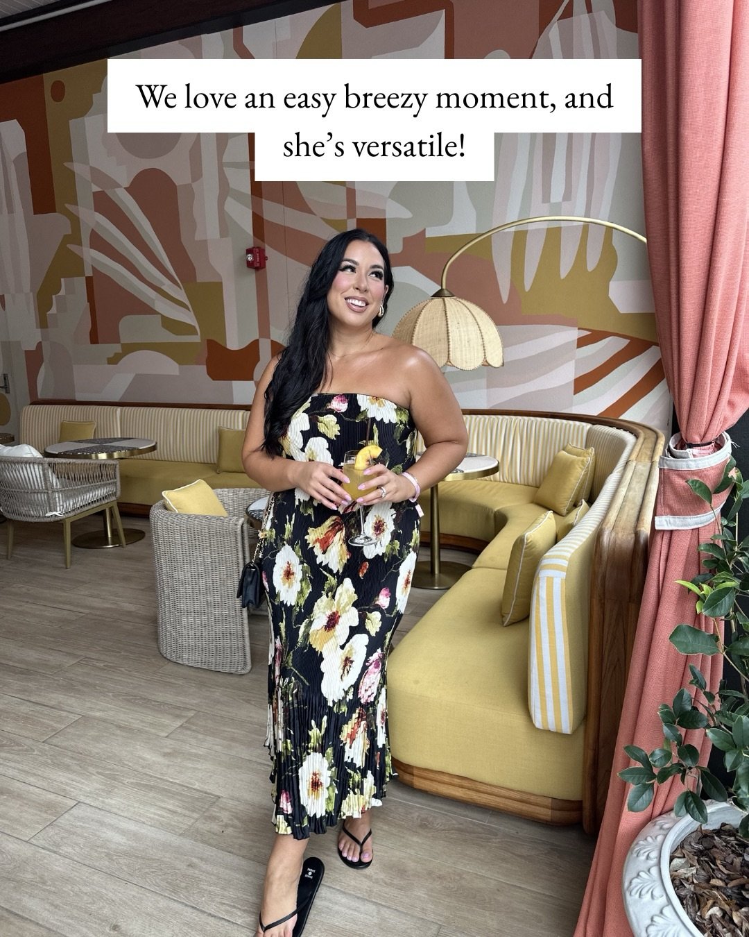 A black floral slip with a pleated hem brings movement and mood. The strapless neckline feels bold, while the soft yellow and cream blooms keep it grounded in spring.