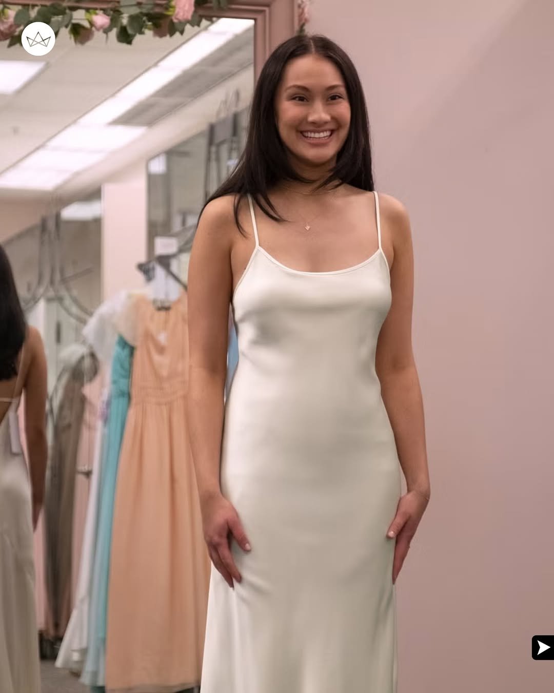 A clean ivory slip with delicate straps feels like modern bridal at its most effortless. No heavy beading, no dramatic layers, just a smooth silhouette that lets the wearer shine.
