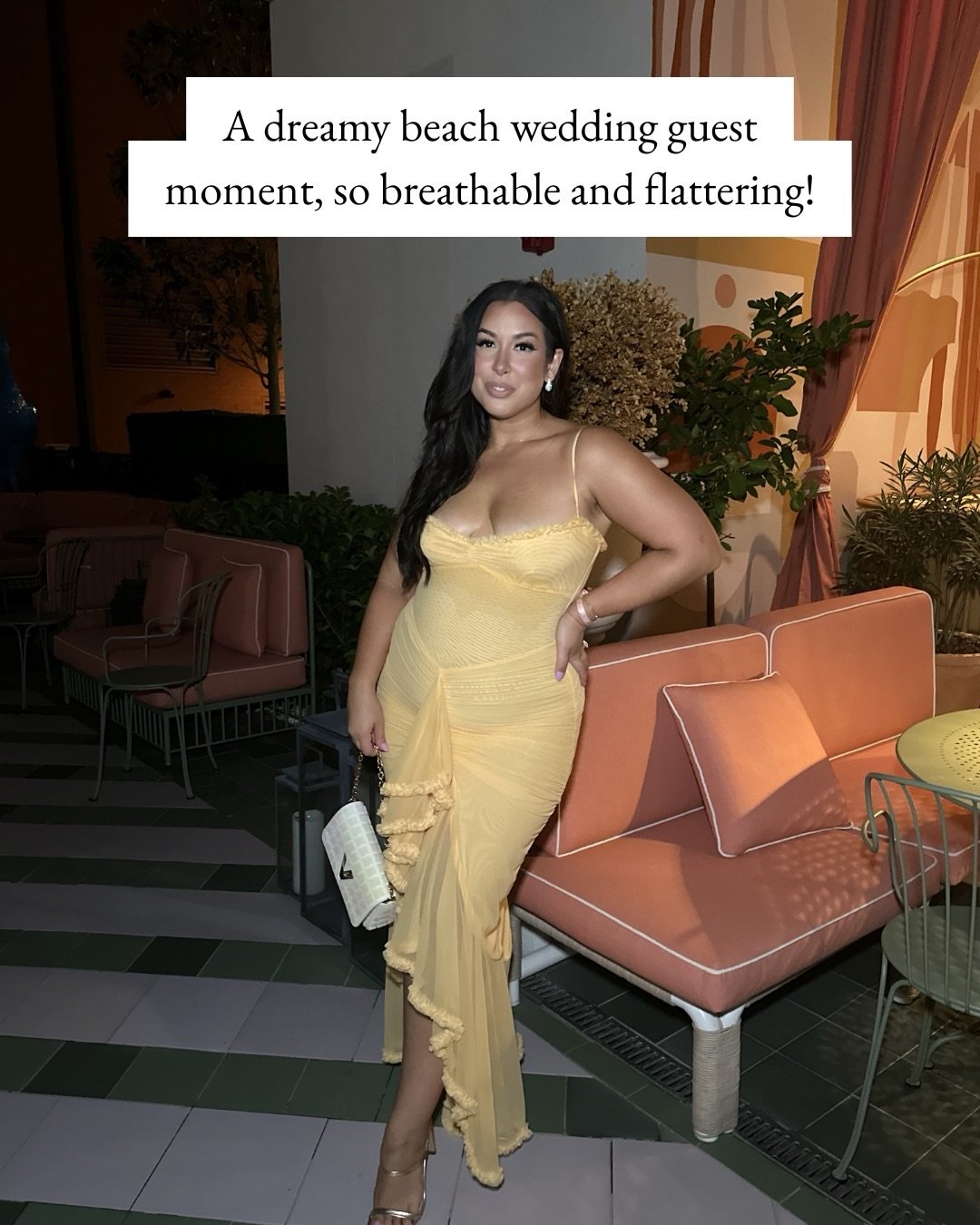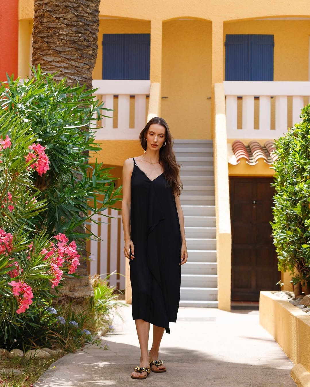 This black slip styled against a sun-washed villa backdrop is minimal in the best way. The silhouette flows, the straps stay delicate, and the flat sandals keep it grounded.