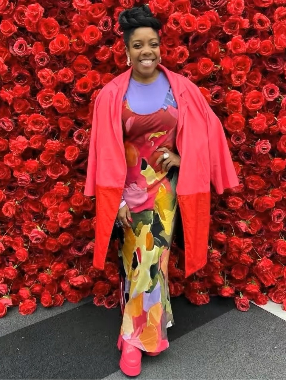This slip dress is not here to whisper. The abstract print, the saturated reds and yellows, the bold topper thrown over the shoulders, it’s a full celebration of color and presence. Styled against that wall of roses, it feels fearless and joyful, like spring turned all the way up.