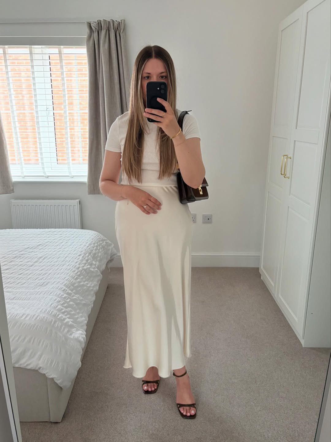 This is everyday slip styling done beautifully. A simple white tee tucked into a silky cream skirt, paired with strappy heels and a structured bag, makes the whole look feel effortless and wearable.