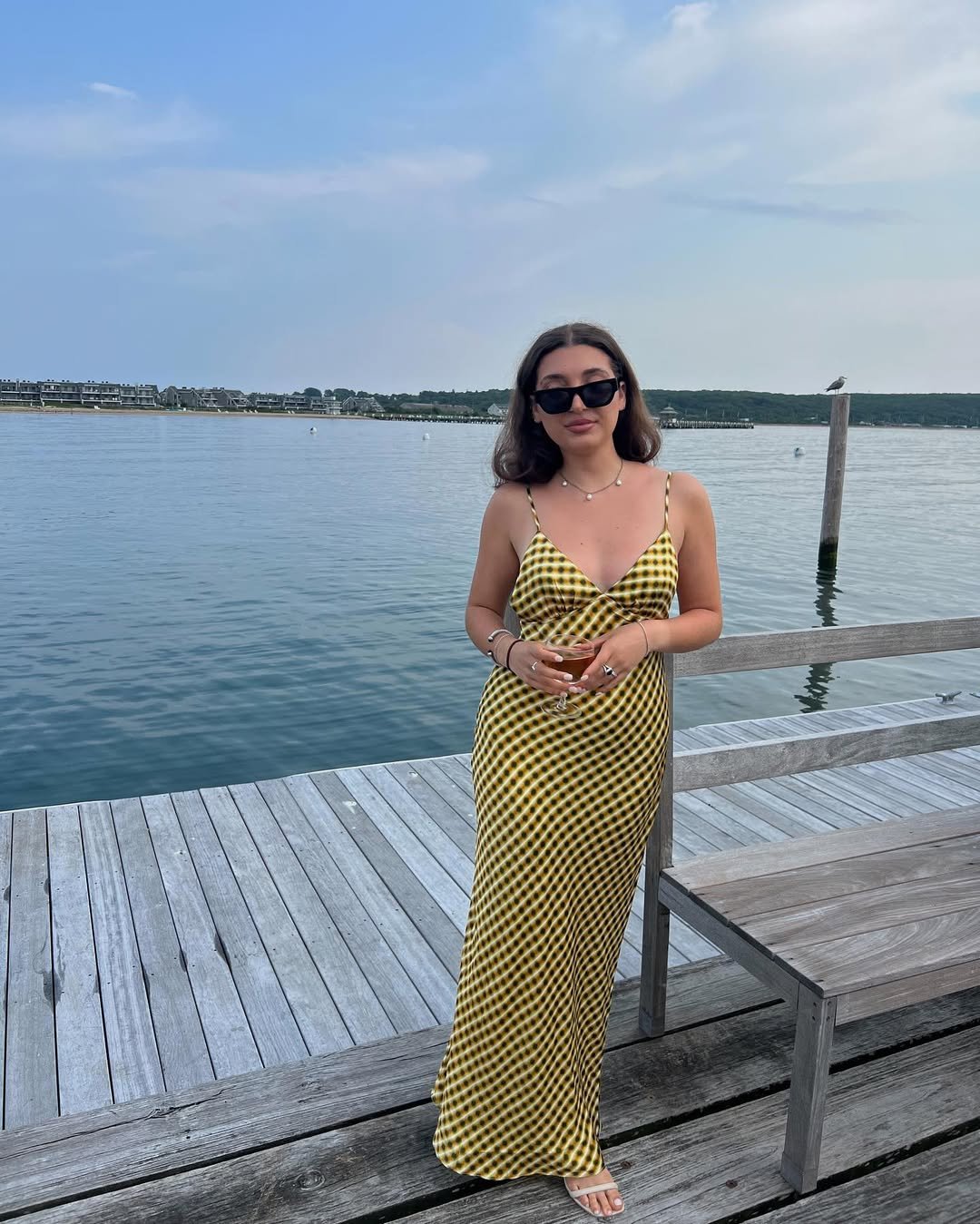A printed slip by the water just feels right. The golden pattern pops against the soft blues of the harbor, and the slim straps keep the look breezy and unfussy.