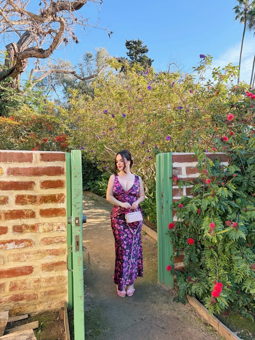 I love how the print feels bold but balanced against the natural setting. With a petite clutch and strappy heels, it becomes occasion-ready in seconds. A reminder that sometimes all you need is a great slip dress and a blooming backdrop.