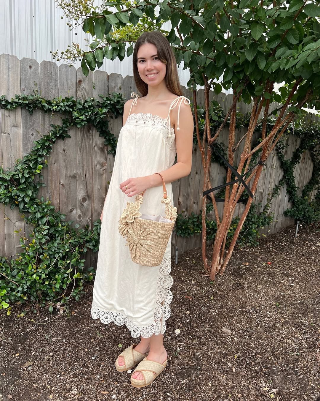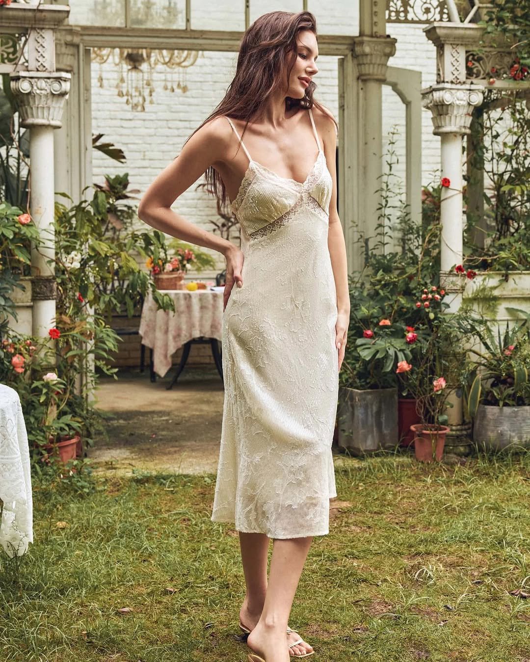This ivory lace slip feels straight out of an old-world garden. The delicate straps, soft texture, and barely-there sandals make it light and airy, almost like it belongs among climbing roses and linen tablecloths.