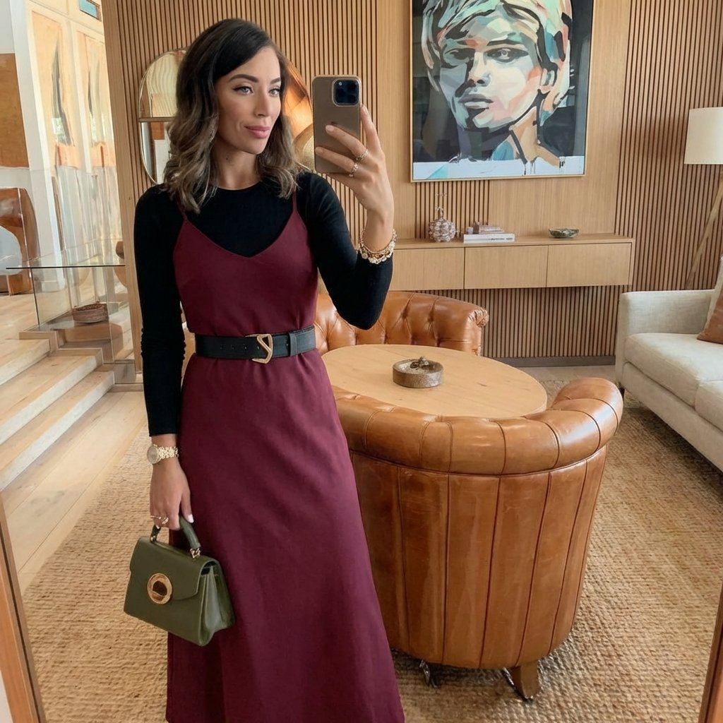 A deep burgundy slip layered over a black long sleeve instantly feels fall-ready and polished. The belted waist adds shape, while the structured green handbag introduces a subtle color contrast.