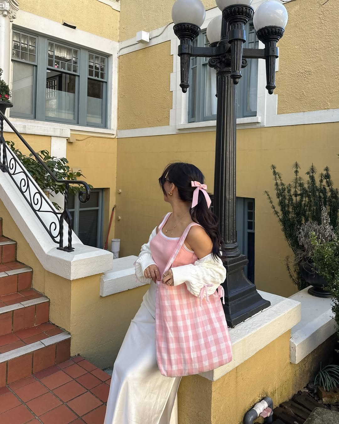 I love how the gingham tote adds a playful touch against the warm yellow backdrop. It’s sweet but still grown. Like you planned your outfit for a café date but also for the photos you’ll secretly love later.