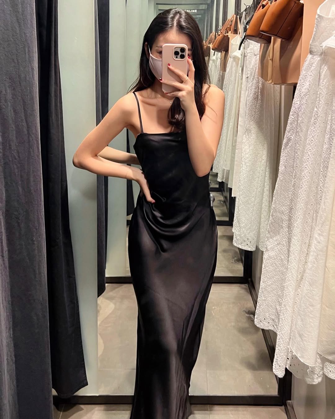 There’s something about a black satin slip in a fitting room mirror that just hits. The fabric drapes effortlessly, catching light in all the right places, and those delicate straps keep it minimal and sleek.