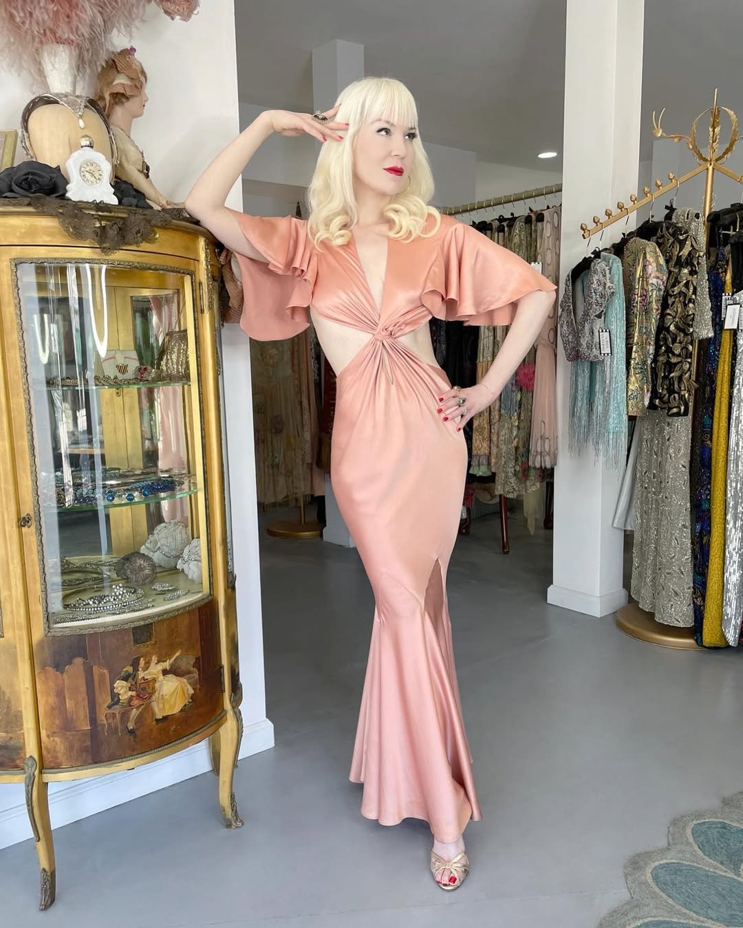 This peach satin gown with flutter sleeves and a dramatic twist-front detail feels straight out of old Hollywood. The cutouts, the drape, the fitted hem, it’s bold and unapologetic.
