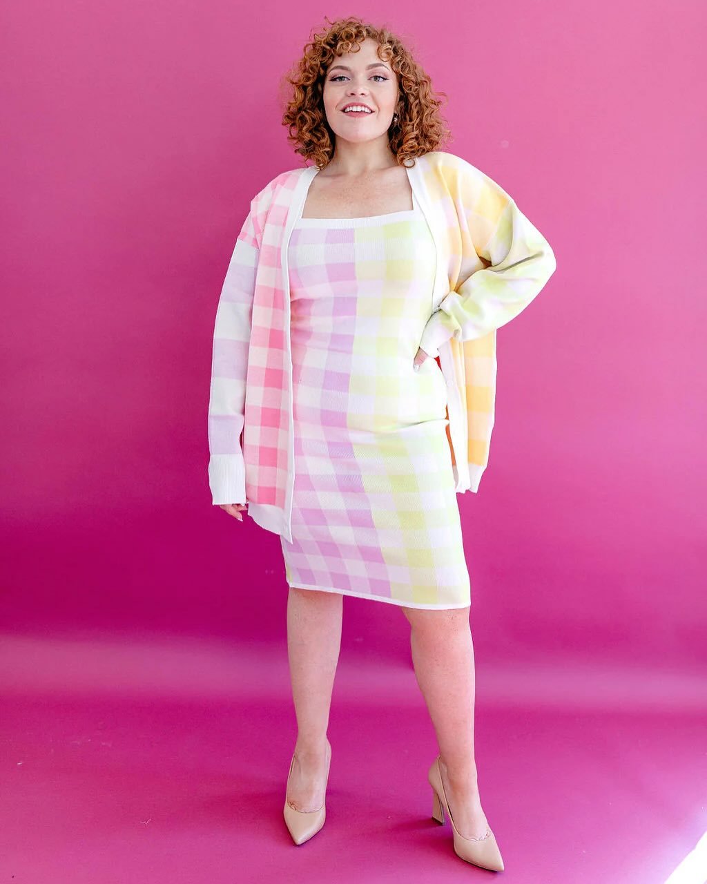 This outfit is pure pastel perfection. The gingham-inspired dress and cardigan combo blends soft pinks, yellows, and creams into a palette that feels playful but still refined. Set against that bold pink backdrop, the whole look pops in the best possible way.