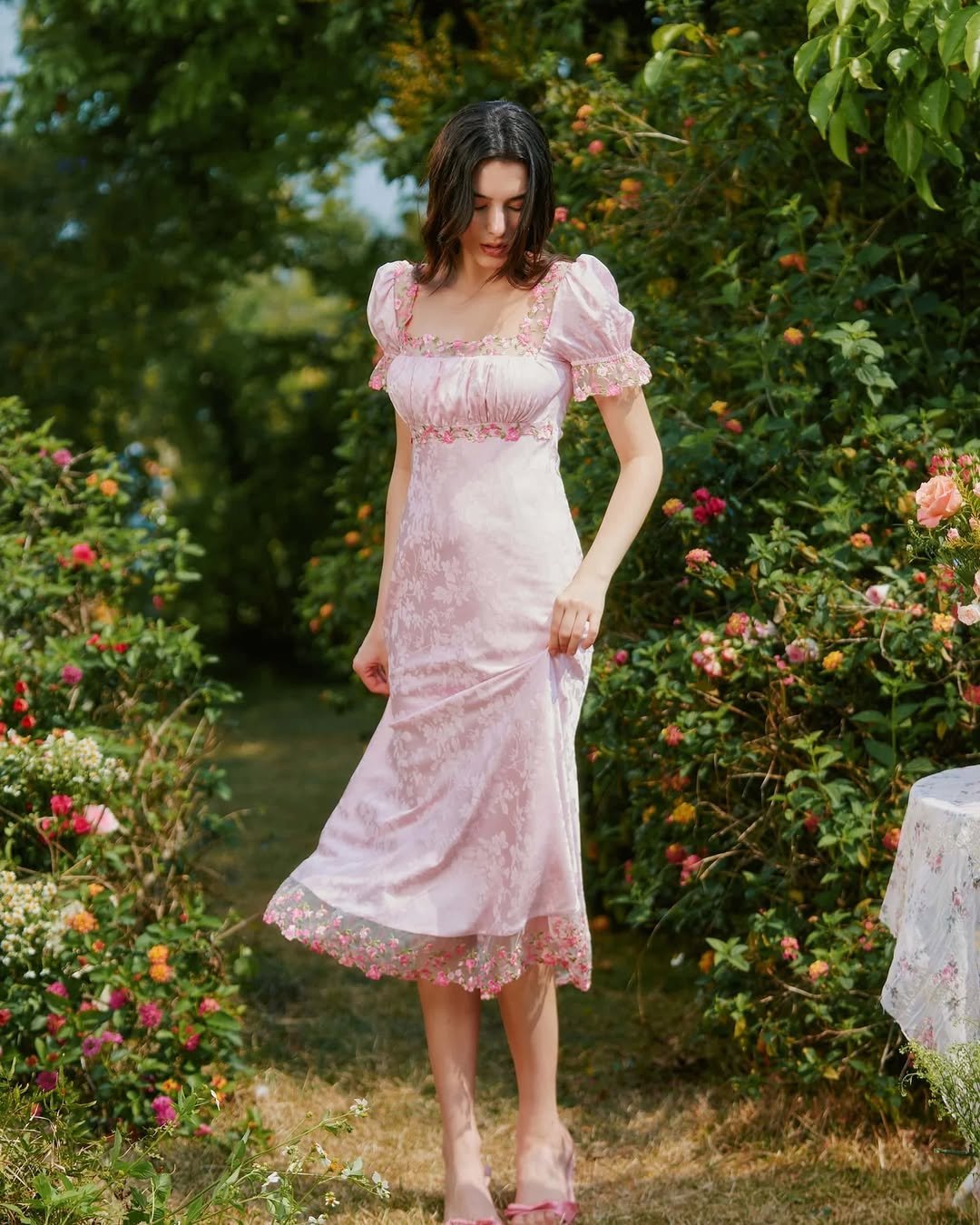 This dress feels like it was made for a slow Easter morning in a blooming garden. The soft blush satin catches the sunlight in the prettiest way, while the delicate floral trim and puff sleeves add just enough vintage charm to make the whole look feel straight out of a storybook.