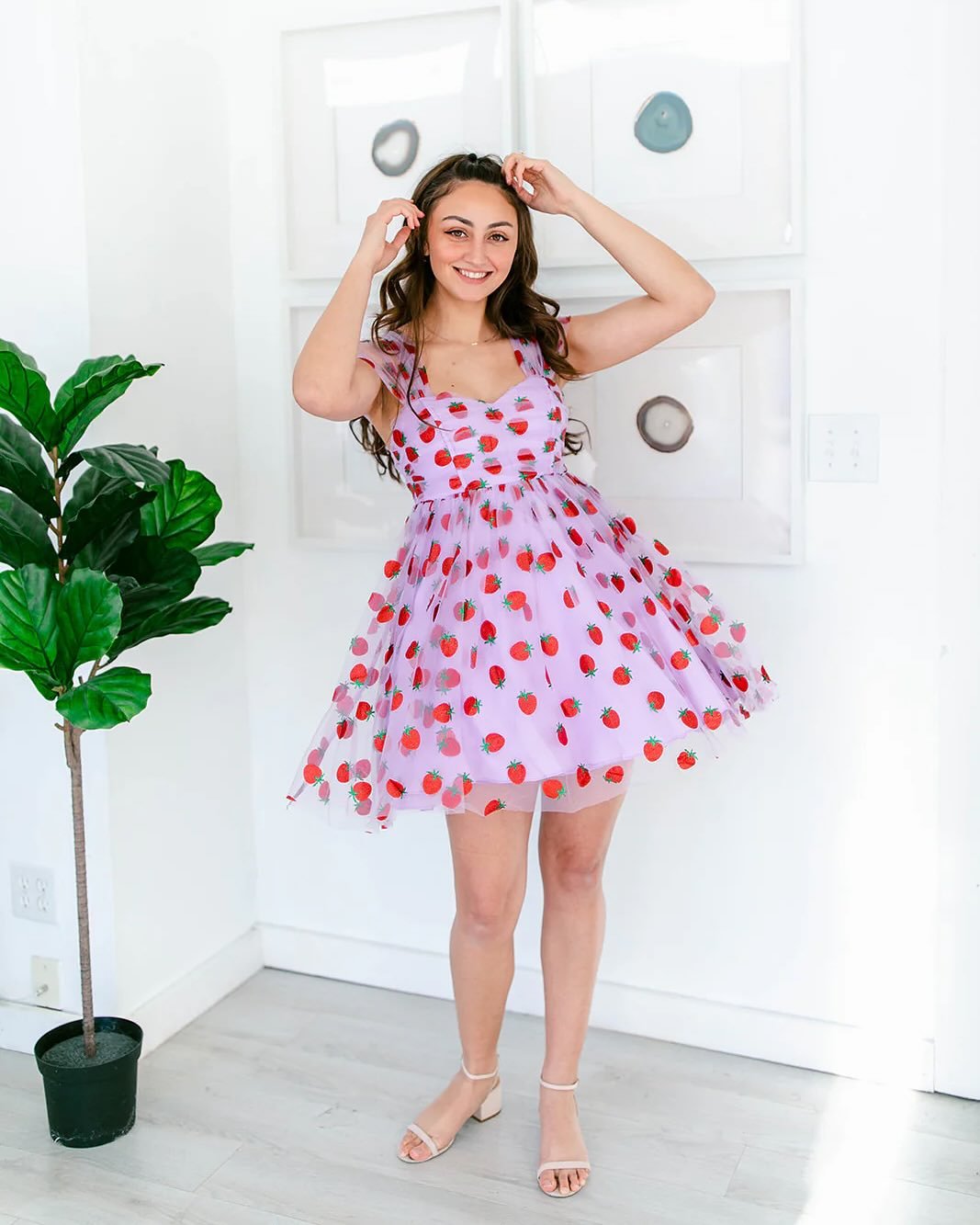 This dress feels like a dessert you can wear. The soft pink tulle layered with playful strawberry prints gives the whole outfit a dreamy, whimsical charm that feels straight out of a fairytale.
