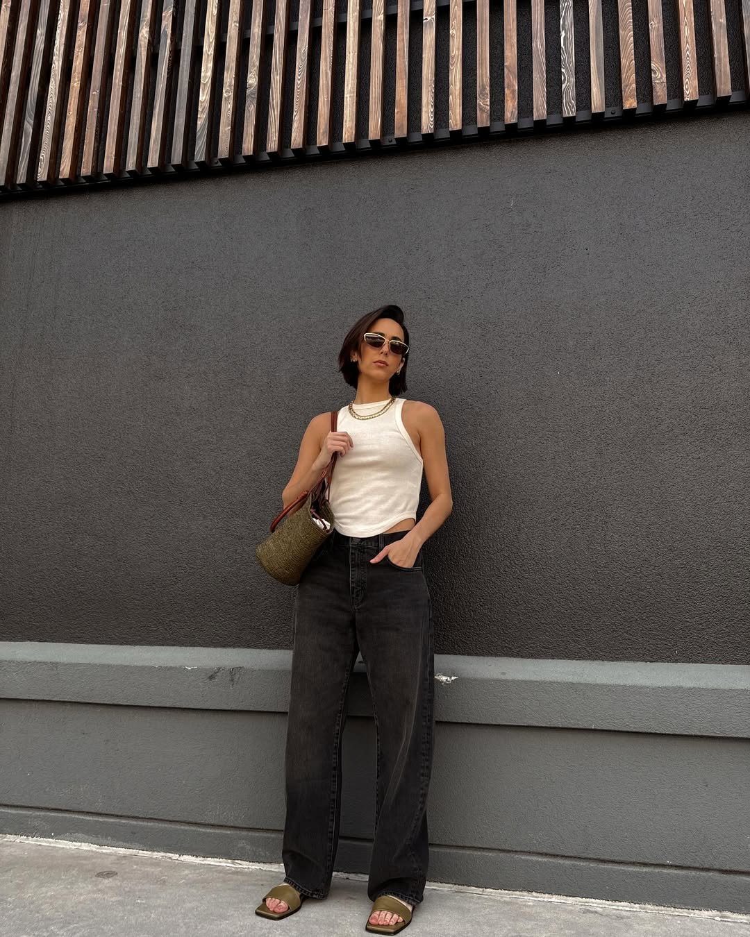 Sleek sunglasses and a woven bag bring in texture without clutter. It’s one of those outfits that whispers cool. No extra layers needed, just sharp lines and confidence.