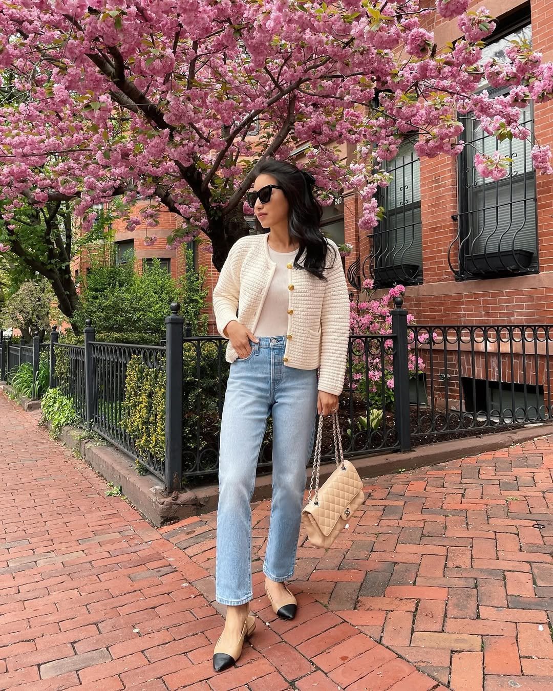 A quilted cream jacket under pink blossoms is peak spring energy. Paired with light-wash straight jeans and cap-toe flats, the whole look leans timeless with a hint of Paris.