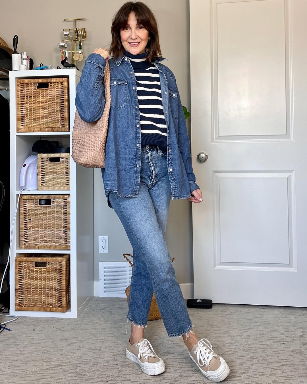 The neutral sneakers and woven tote keep it grounded and practical. This is the outfit for market mornings and casual lunches, when you want comfort but still feel polished. Double denim works beautifully here because the washes are slightly different, so it feels intentional instead of matchy.