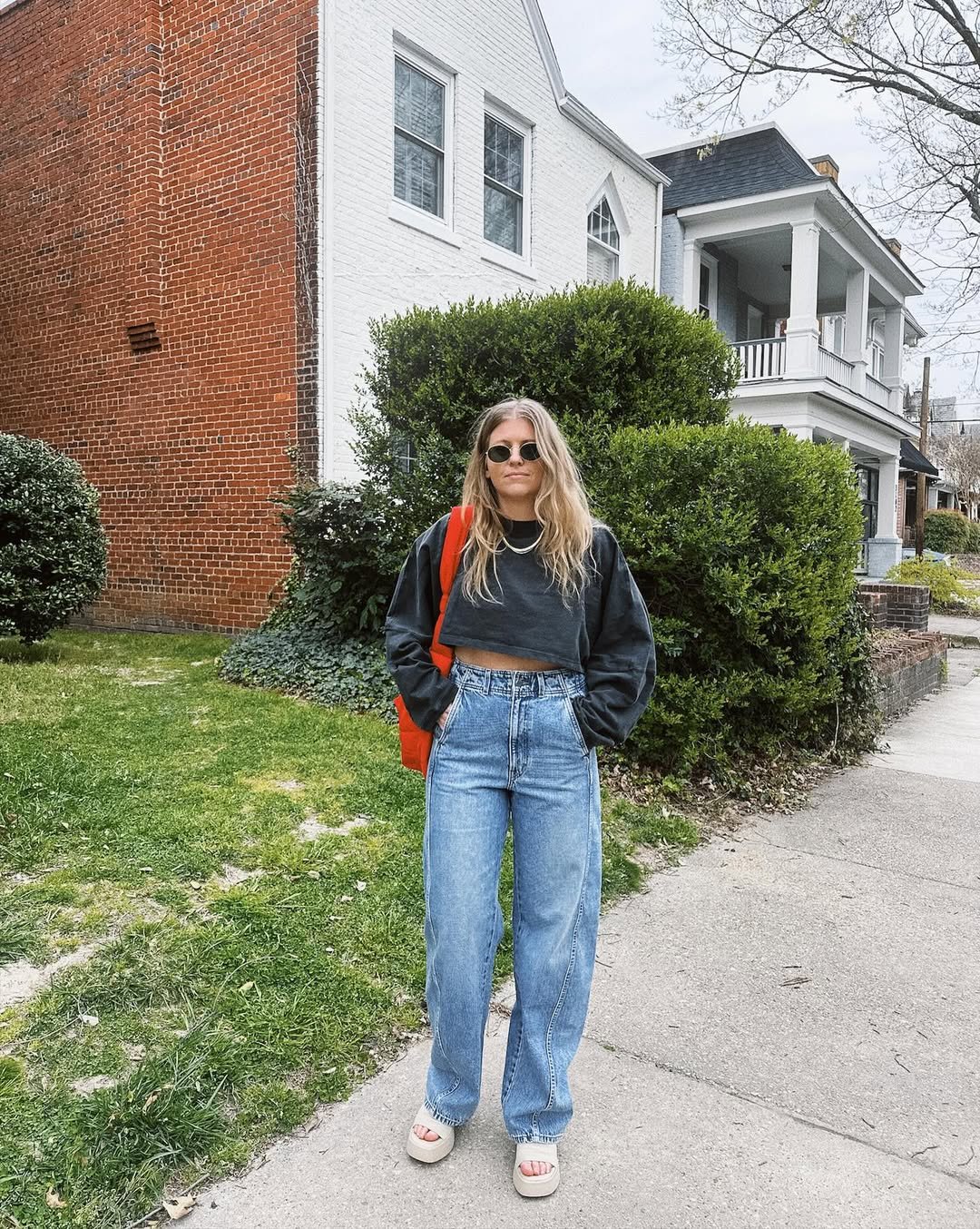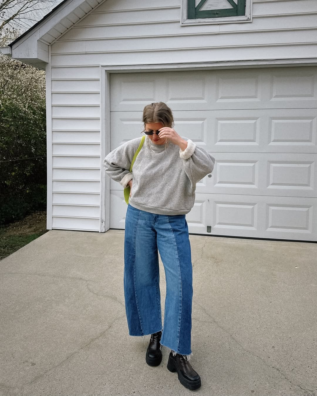 Wide-leg jeans and a soft, oversized sweatshirt feel like the ultimate in-between-season uniform. The proportions are roomy, but the cropped length and chunky boots keep it sharp.