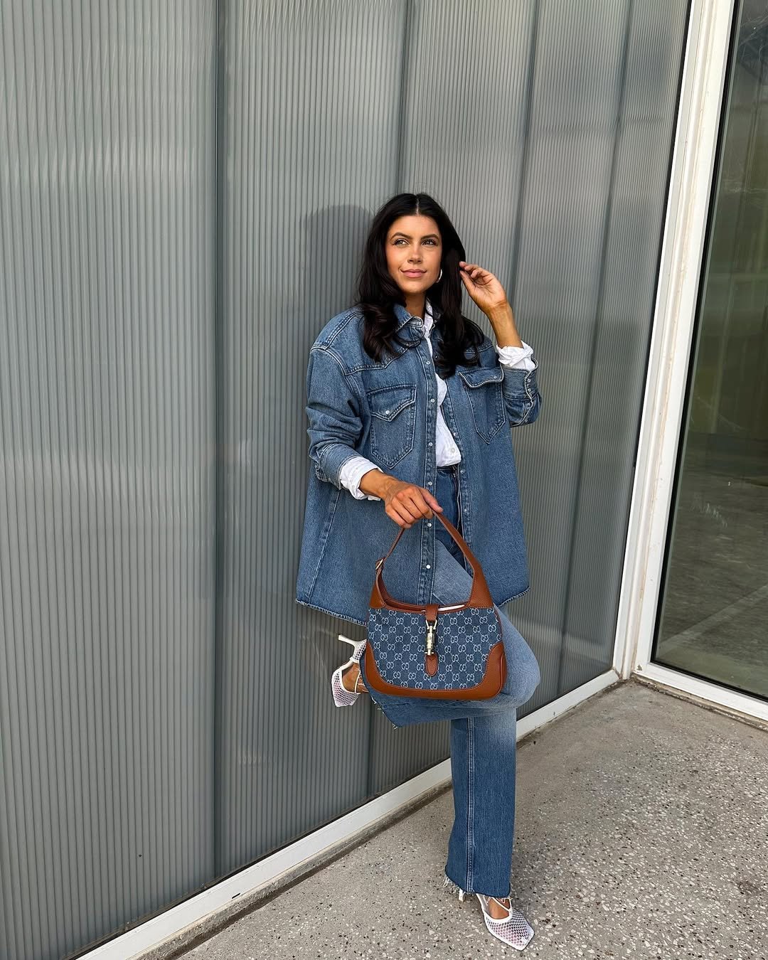White mesh flats and a logo shoulder bag give it personality. When you mix proportions like this, relaxed on top, streamlined below, double denim suddenly feels fresh again.