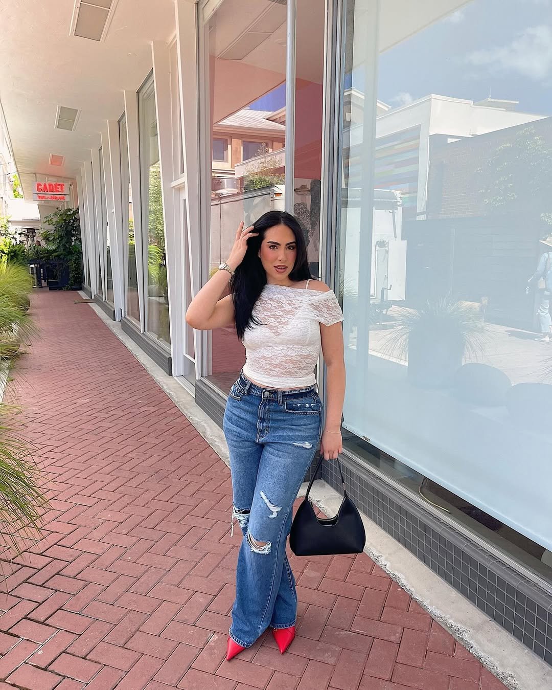A fitted lace top with distressed flares is pure confidence. The texture of the lace contrasts beautifully with the worn-in denim, creating that high-low energy we love.
