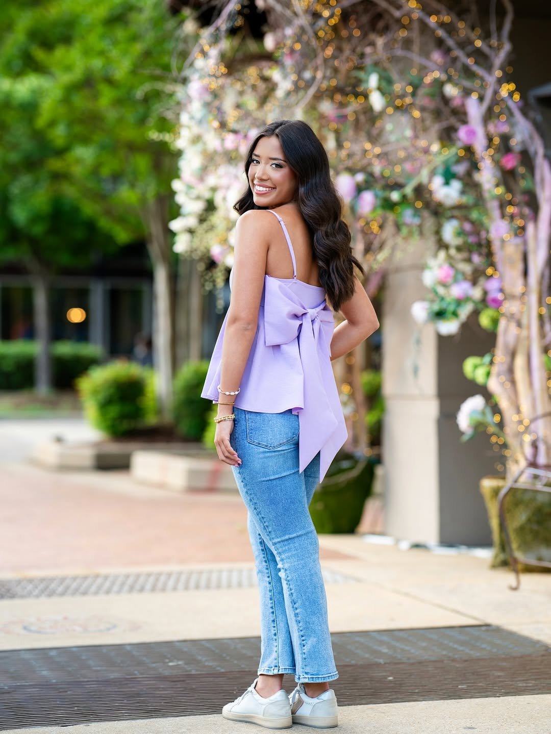 That lilac bow-back top is pure spring energy. Paired with slim light-wash jeans and clean white sneakers, the whole look feels fresh, feminine, and ready for golden hour.