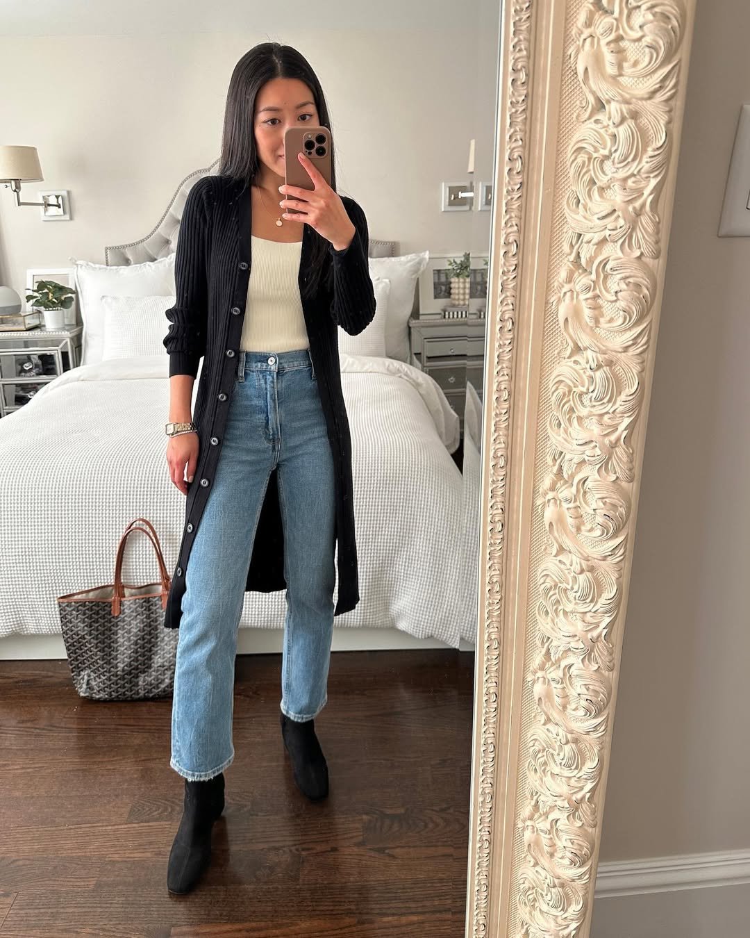 There’s something so satisfying about a long black cardigan sweeping over straight-leg jeans. It adds movement, depth, and just enough drama to an otherwise simple tank-and-denim base.