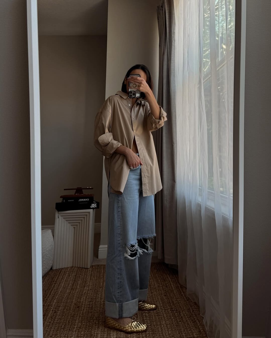 An oversized beige button-down layered over relaxed, cuffed denim gives that effortless borrowed-from-the-boys energy. The distressed knee adds edge, while metallic flats catch the light in the most unexpected way.