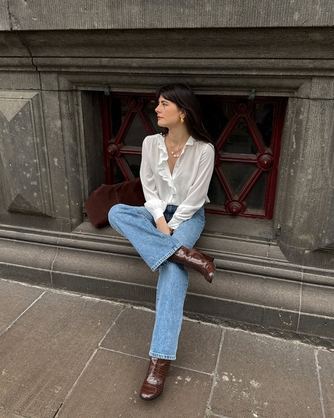 Brown leather boots add warmth and texture, making the whole look feel grounded. It’s the kind of outfit that works for a café date or a quiet stroll through the city.