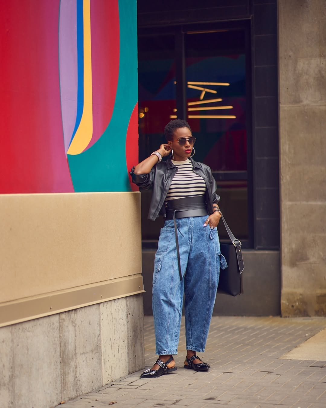 Chunky flats and bold accessories complete the look with confidence. The volume of the jeans is balanced by the fitted layers on top, which keeps the shape flattering and strong.