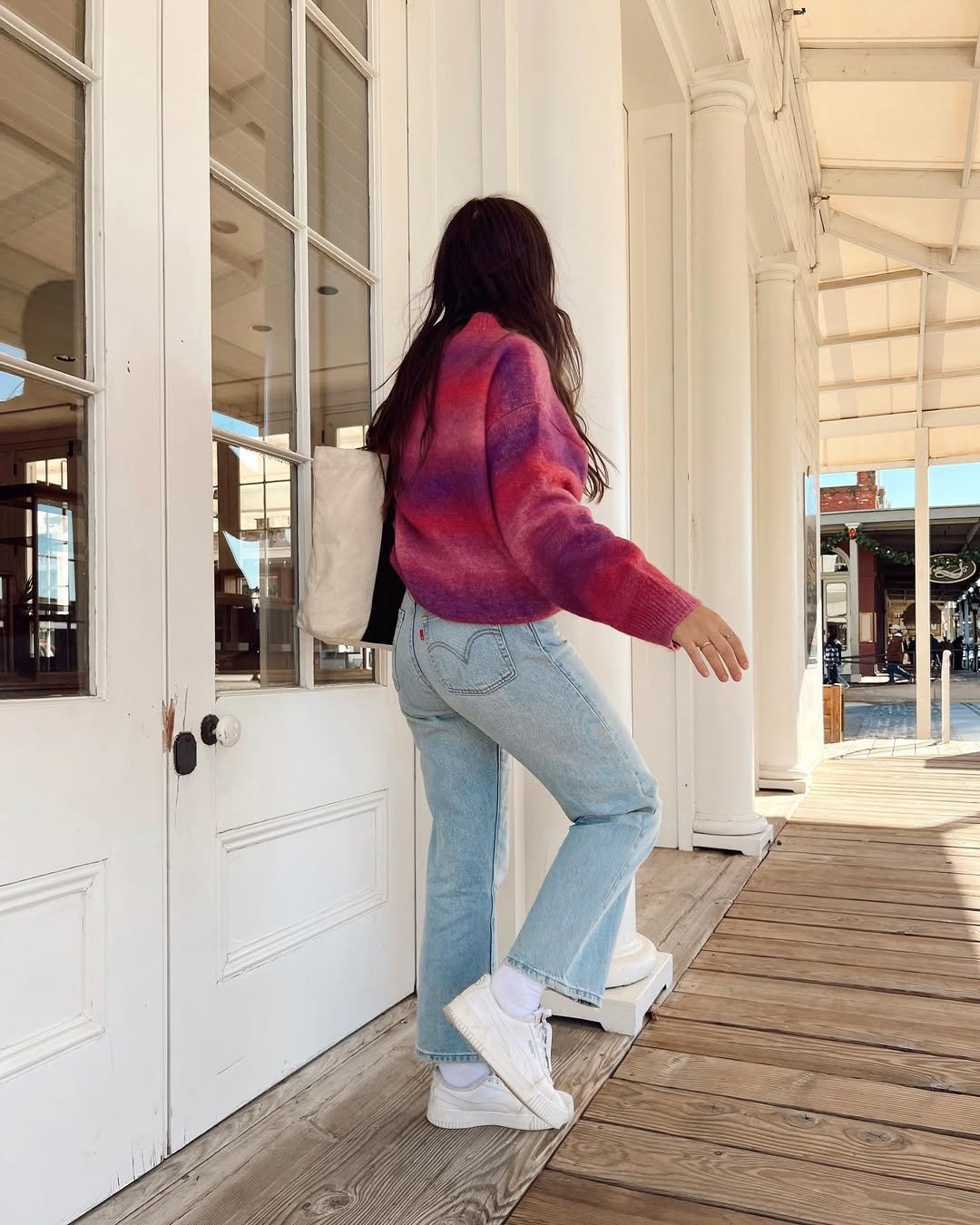 A vibrant ombré sweater in sunset hues instantly warms up classic light-wash jeans. The white sneakers and crew socks keep it grounded and approachable.