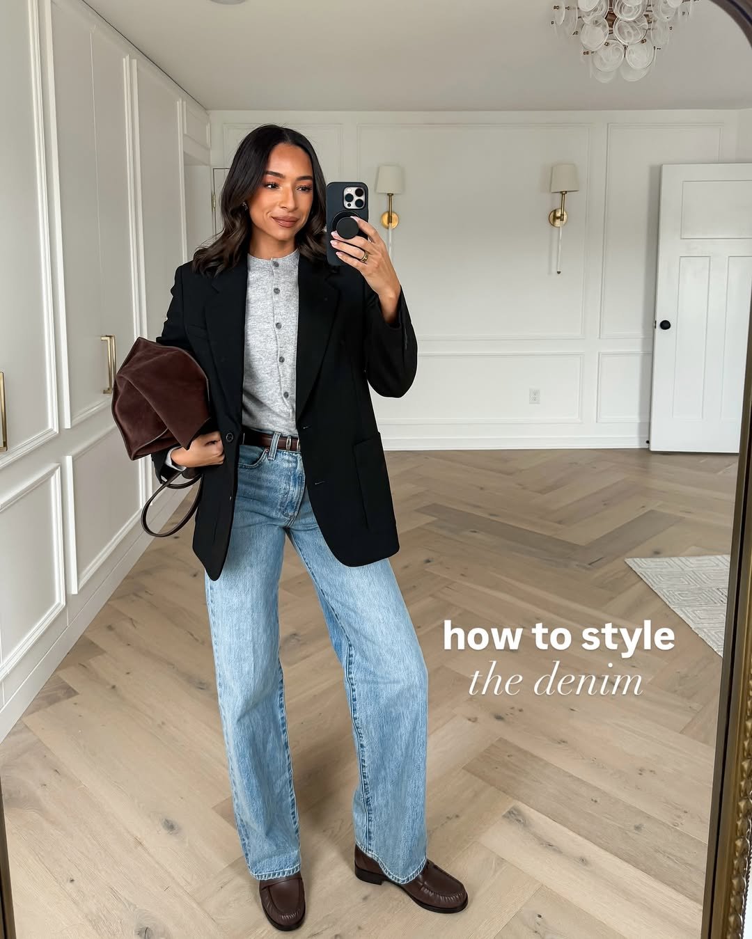 The leather clutch adds depth and warmth. When you blend structured pieces with relaxed denim, you get that quiet luxury effect that always looks put together.