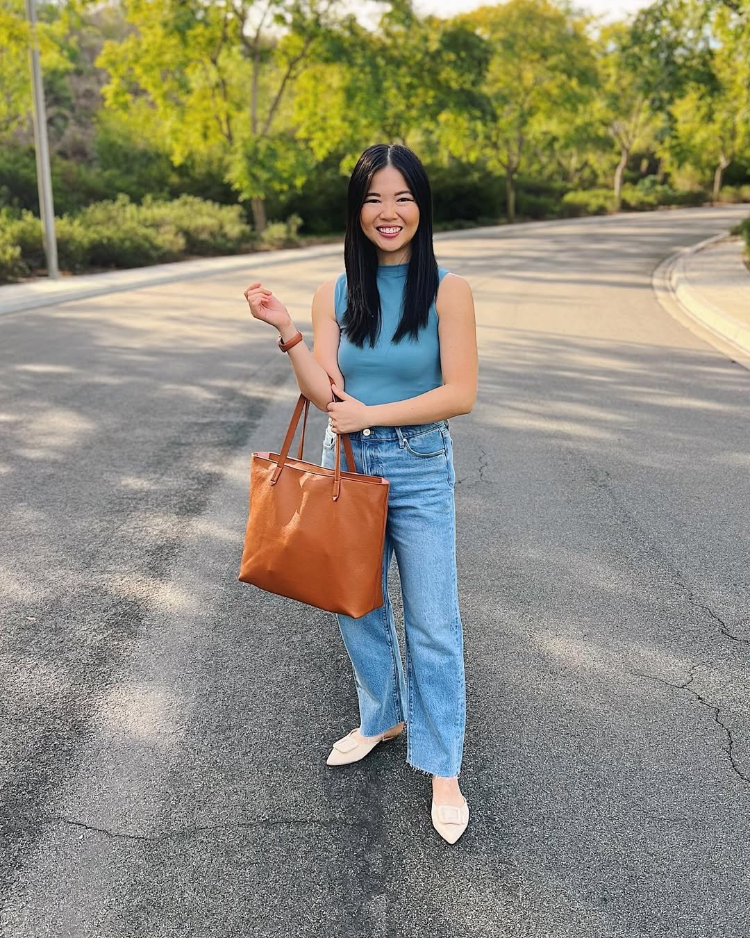 A sleeveless teal top tucked into straight-leg jeans feels simple, but the details make it sing. The warm leather tote and neutral flats soften the look and bring in that easy spring palette.
