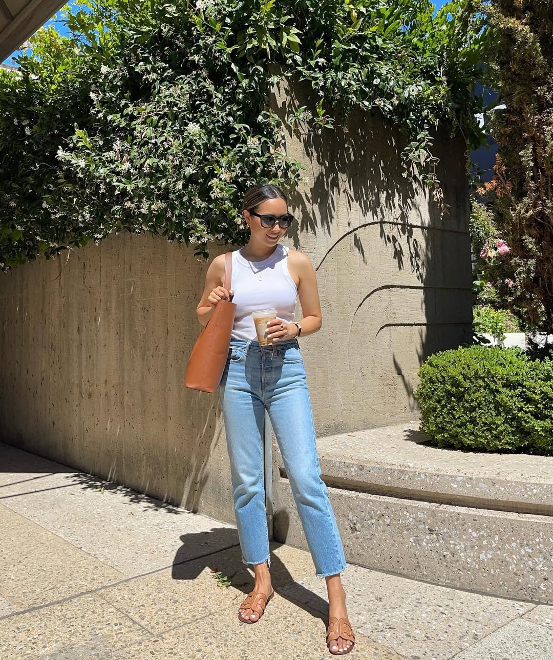 A fitted white tank with straight-leg jeans is spring distilled into an outfit. Add simple sandals and a structured tote, and it feels fresh, light, and ready for sunshine.
